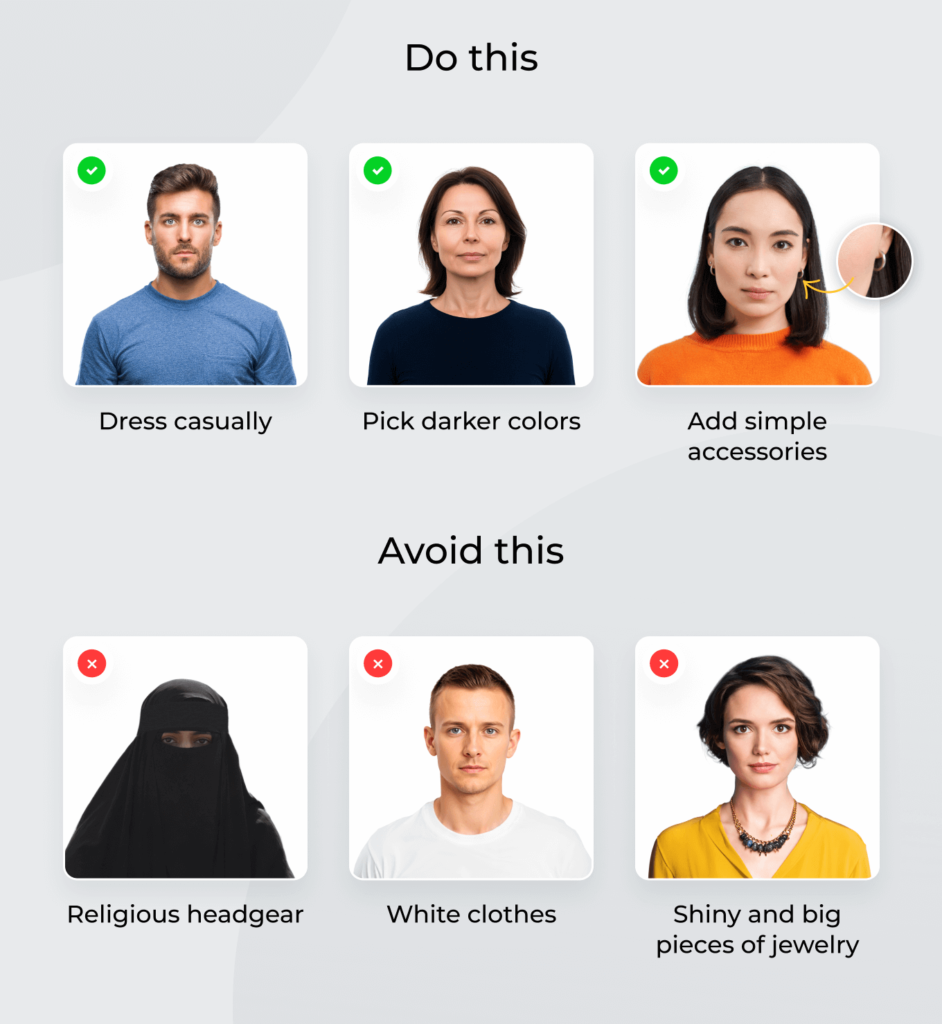 Make sure that your clothing contrasts with the white background, so you stand out clearly in the image. Also, choose a top that does not cover your shoulders or neck, as the photo should show your full face and upper shoulders.