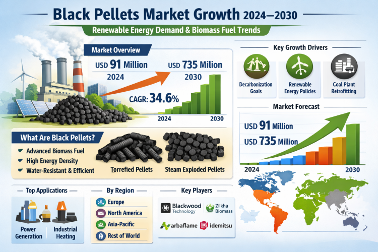 The global Black Pellets market was valued at USD 91 million in 2024 and is expected to reach USD 735 million by 2030, growing at a CAGR of 34.6%. Growth is driven by decarbonization goals, renewable energy policies, and rising adoption of advanced biomass fuels for power generation and coal plant co-firing.