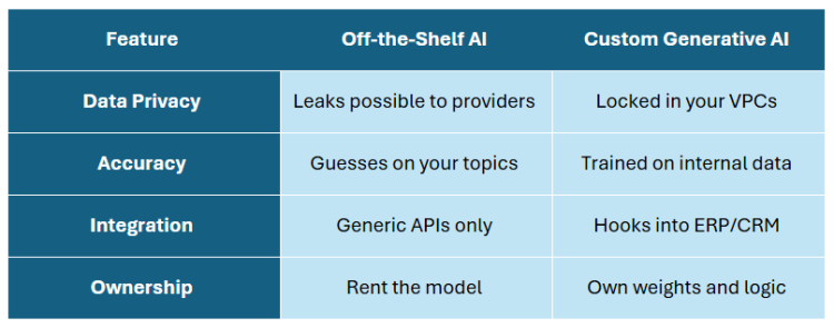 Generic AI handles basic tasks fine. But it blanks on your supply chain quirks or compliance rules. Custom work turns that weakness into a strength.