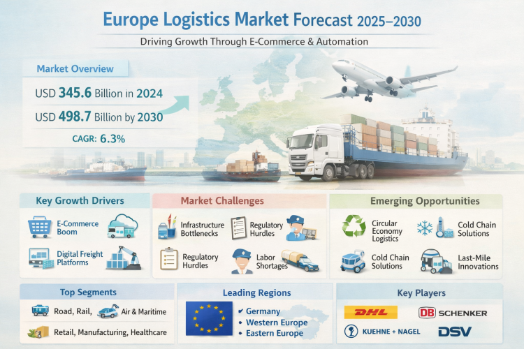 The Europe logistics market was valued at USD 345.6 billion in 2024 and is projected to reach USD 498.7 billion by 2030, growing at a CAGR of 6.3%. Growth is driven by expanding e-commerce, digital freight platforms, warehouse automation, and rising demand for efficient, technology-driven supply chain solutions.
