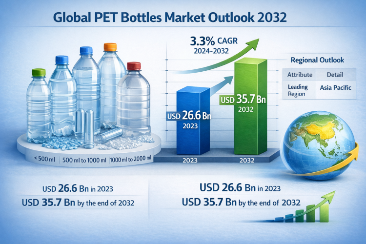 The global PET bottles market was valued at USD 26.6 Bn in 2023 and is projected to reach USD 35.7 Bn by the end of 2032. Supported by rising demand from the beverage, food, and personal care industries, along with the growing focus on lightweight and recyclable packaging solutions, the market is expected to expand at a CAGR of 3.3% from 2024 to 2032.