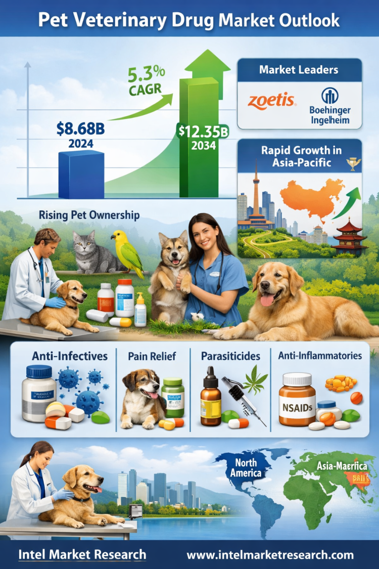 According to a new report from Intel Market Research, the global Pet Veterinary Drug market was valued at USD 8.68 billion in 2024 and is projected to reach USD 12.35 billion by 2034, growing at a steady CAGR of 5.3% during the forecast period (2025–2034). This growth is fueled by increasing pet ownership worldwide, rising awareness of animal healthcare, and continued innovation in veterinary pharmaceuticals.