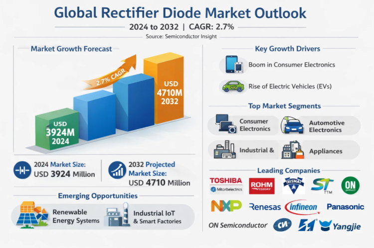 Global Rectifier Diode Market, valued at USD 3924 million in 2024, is on a steady growth path, with projections indicating it will reach USD 4710 million by 2032, expanding at a compound annual growth rate (CAGR) of 2.7% from 2025. This data is detailed in a comprehensive new analysis published by Semiconductor Insight. The study underscores the indispensable role of rectifier diodes as foundational power electronics components, essential for converting alternating current (AC) to direct current (DC) across a vast spectrum of modern technologies.