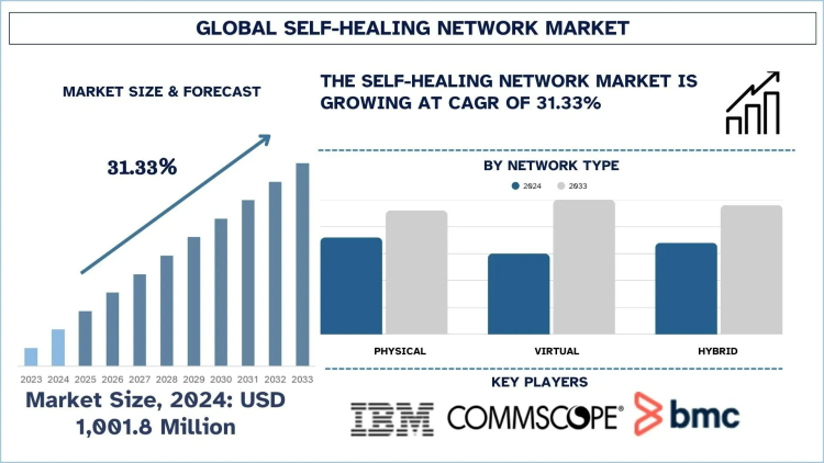 According to the UnivDatos analysis, the growing complexity of modern IT infrastructures, increasing demand for high network uptime, and the rising adoption of technologies like 5G, IoT, and cloud computing are the major factors driving the growth of the self-healing networks Market worldwide. As per their “Self-Healing Networks Market” report, the global market was valued at USD 1,001.8 million in 2024, growing at a CAGR of about 31.33% during the forecast period from 2025 - 2033 to reach USD million by 2033.